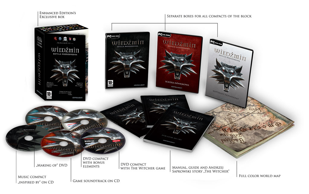 Эксклюзивное издание Ведьмака помимо игры на DVD будет включать DVD-диск с видеоматериалами, DVD-диск с бонусными материалами (в том числе редактор Д’жинни и 2 официальных модуля-приключения: “Цена нейтральности” и “Побочные эффекты”), диск с музыкой из игры, а также CD-диск с музыкой по мотивам игры. Весь новый контент и усовершенствования для зарегистрированных пользователей игры будут доступны бесплатно.